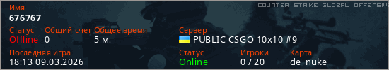 Играет на Counter Strike Global Offensive сервере. Страна: УкраинаПервый раз замечен 18:07 09.03.2026