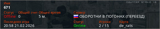 Играет на Counter Strike 1.6 сервере. Страна: РоссияПервый раз замечен 20:54 21.02.2026
