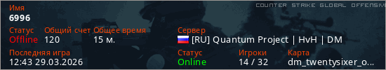 Играет на Counter Strike Global Offensive сервере. Страна: РоссияПервый раз замечен 22:23 27.03.2026
