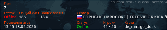 Играет на Counter Strike Global Offensive сервере. Страна: РоссияПервый раз замечен 14:43 09.02.2025