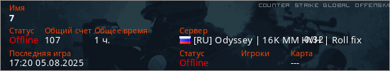 Играет на Counter Strike Global Offensive сервере. Страна: РоссияПервый раз замечен 16:18 01.05.2025