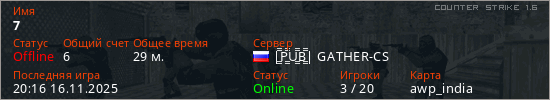 Играет на Counter Strike 1.6 сервере. Страна: РоссияПервый раз замечен 17:43 06.07.2025