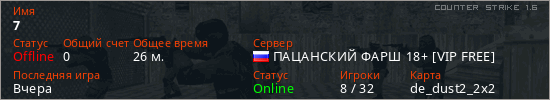 Играет на Counter Strike 1.6 сервере. Страна: РоссияПервый раз замечен 16:37 07.03.2026