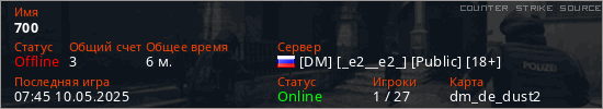 Играет на Counter Strike Source сервере. Страна: РоссияПервый раз замечен 07:42 10.05.2025