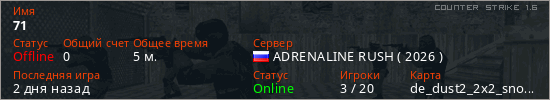 Играет на Counter Strike 1.6 сервере. Страна: РоссияПервый раз замечен 14:17 27.12.2025