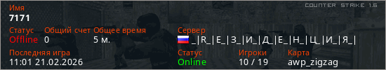 Играет на Counter Strike 1.6 сервере. Страна: РоссияПервый раз замечен 10:59 21.02.2026