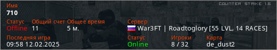Играет на Counter Strike 1.6 сервере. Страна: РоссияПервый раз замечен 09:52 12.02.2025