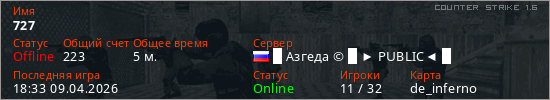 Играет на Counter Strike 1.6 сервере. Страна: РоссияПервый раз замечен 18:12 09.04.2026