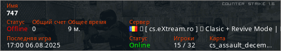 Играет на Counter Strike 1.6 сервере. Страна: РумынияПервый раз замечен 14:53 27.07.2025