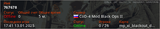 Играет на Call of Duty 4: Modern Warfare сервере. Страна: РоссияПервый раз замечен 17:33 13.01.2025