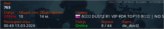 Играет на Counter Strike Global Offensive сервере. Страна: РоссияПервый раз замечен 23:05 14.03.2026