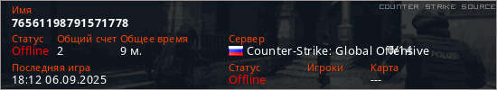 Играет на Counter Strike Source сервере. Страна: РоссияПервый раз замечен 17:33 05.09.2025
