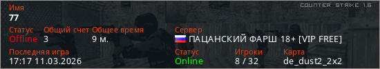 Играет на Counter Strike 1.6 сервере. Страна: РоссияПервый раз замечен 12:48 09.03.2026