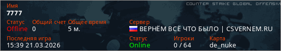 Играет на Counter Strike Global Offensive сервере. Страна: РоссияПервый раз замечен 15:37 21.03.2026