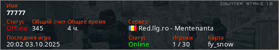 Играет на Counter Strike 1.6 сервере. Страна: РумынияПервый раз замечен 11:02 09.09.2024