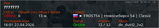 Играет на Counter Strike 1.6 сервере. Страна: РоссияПервый раз замечен 15:23 22.04.2026