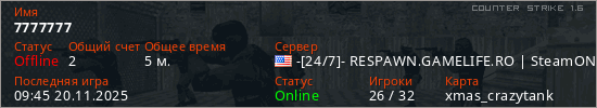 Играет на Counter Strike 1.6 сервере. Страна: СШАПервый раз замечен 09:39 20.11.2025