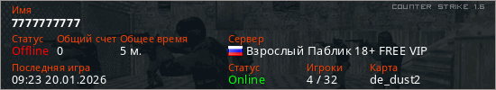 Играет на Counter Strike 1.6 сервере. Страна: РоссияПервый раз замечен 06:25 20.01.2026