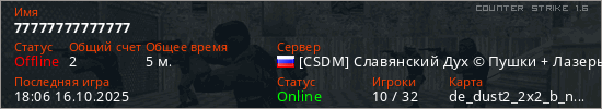 Играет на Counter Strike 1.6 сервере. Страна: РоссияПервый раз замечен 17:45 16.10.2025