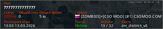 Играет на Counter Strike 1.6 сервере. Страна: РоссияПервый раз замечен 12:33 13.03.2026