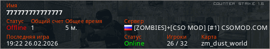 Играет на Counter Strike 1.6 сервере. Страна: РоссияПервый раз замечен 19:20 26.02.2026