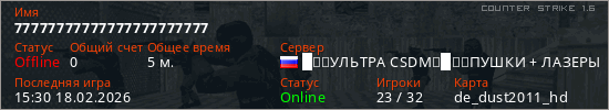 Играет на Counter Strike 1.6 сервере. Страна: РоссияПервый раз замечен 14:34 18.02.2026