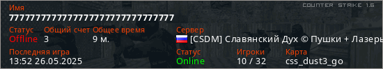 Последний раз был в сети 13:52 26.05.2025 Игрок с таким ником замечен на 30 серверах