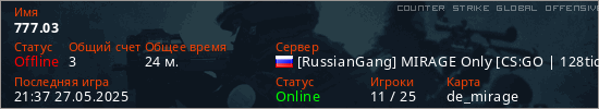 Играет на Counter Strike Global Offensive сервере. Страна: РоссияПервый раз замечен 20:20 11.05.2025