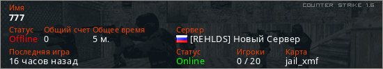 Играет на Counter Strike 1.6 сервере. Страна: РоссияПервый раз замечен 17:27 14.01.2026
