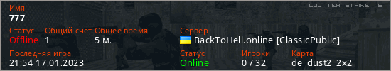 Играет на Counter Strike 1.6 сервере. Страна: УкраинаПервый раз замечен 21:52 17.01.2023