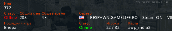 Последний раз был в сети Вчера Игрок с таким ником замечен на 68 серверах