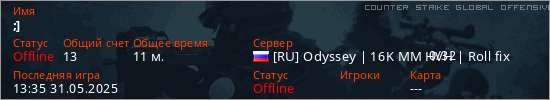 Играет на Counter Strike Global Offensive сервере. Страна: РоссияПервый раз замечен 12:38 31.05.2025
