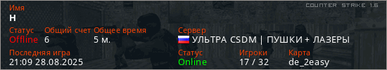 Играет на Counter Strike 1.6 сервере. Страна: РоссияПервый раз замечен 21:07 28.08.2025
