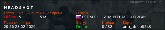Играет на Counter Strike 1.6 сервере. Страна: РоссияПервый раз замечен 20:27 23.02.2026