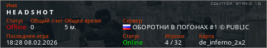 Играет на Counter Strike 1.6 сервере. Страна: РоссияПервый раз замечен 18:03 08.02.2026