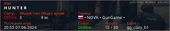 Играет на Counter Strike Source сервере. Страна: РоссияПервый раз замечен 19:45 29.05.2024