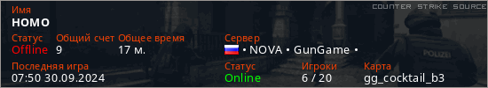 Играет на Counter Strike Source сервере. Страна: РоссияПервый раз замечен 18:42 04.08.2023