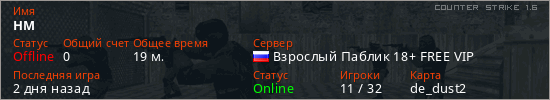 Последний раз был в сети 2 дня назад Игрок с таким ником замечен на 16 серверах