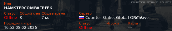 Играет на Counter Strike Source сервере. Страна: РоссияПервый раз замечен 16:37 08.02.2026
