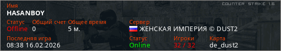 Играет на Counter Strike 1.6 сервере. Страна: РоссияПервый раз замечен 08:36 16.02.2026