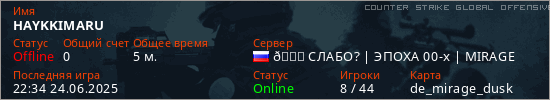 Играет на Counter Strike Global Offensive сервере. Страна: РоссияПервый раз замечен 21:35 24.06.2025