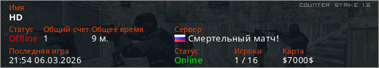 Играет на Counter Strike 1.6 сервере. Страна: РоссияПервый раз замечен 21:39 06.03.2026