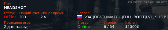 Играет на Counter Strike Source сервере. Страна: РоссияПервый раз замечен 19:25 06.08.2025