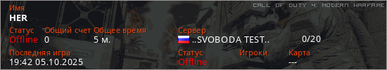 Играет на Call of Duty 4: Modern Warfare сервере. Страна: РоссияПервый раз замечен 19:40 05.10.2025