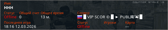 Играет на Counter Strike 1.6 сервере. Страна: РоссияПервый раз замечен 16:59 09.03.2026