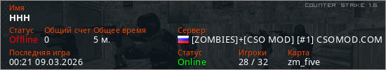 Играет на Counter Strike 1.6 сервере. Страна: РоссияПервый раз замечен 00:00 09.03.2026