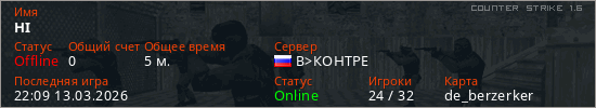 Играет на Counter Strike 1.6 сервере. Страна: РоссияПервый раз замечен 22:01 13.03.2026