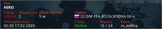 Играет на Counter Strike Global Offensive сервере. Страна: РоссияПервый раз замечен 02:13 17.02.2026