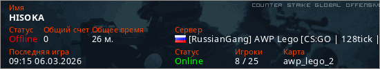 Играет на Counter Strike Global Offensive сервере. Страна: РоссияПервый раз замечен 18:08 05.03.2026