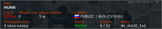 Играет на Counter Strike 1.6 сервере. Страна: РоссияПервый раз замечен 15:30 29.03.2026